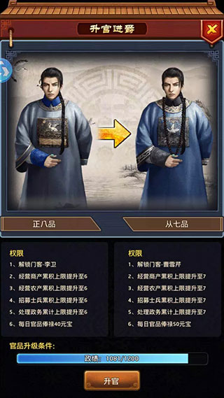 6、关于衙门论战,满十五个门客开启,这就要看你培养的门客怎么样了,哦,说到这里不得不提一个很容易忽略的问题,记得重点门客多去书堂看书学技能,有意想不到的收获。