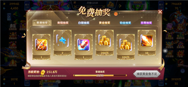 玩家捕获到一定数量的黄金鱼可获取抽奖次数,有机会抽到大量金币奖励。