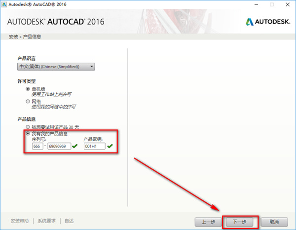 7、许可类型选择【单机版】,输入序列号【666-69696969】,输入产品密钥【001H1】,点击【下一步】。