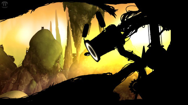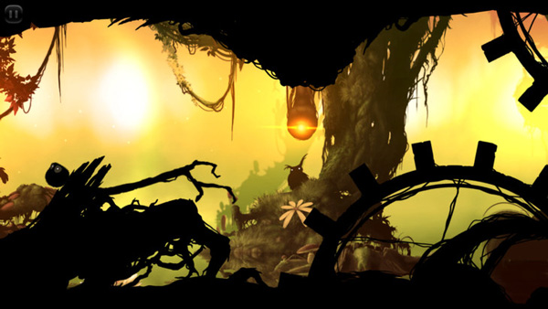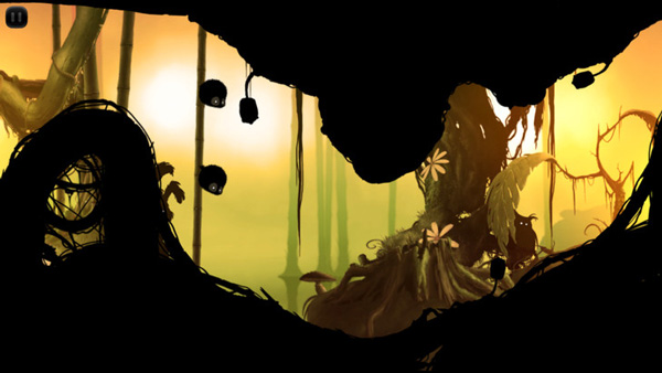 2、图中眨巴着眼睛的小黑球就是我们这场森林冒险忠实的小伙伴了,点击屏幕后,整个画面就会匀速后退,这是唯有不断点击屏幕才可以让小黑往前飞,飞越枯木与砾石,躲避机关和陷阱,抵达森林的尽头。