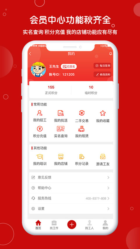 1、如何获得积分? 进入“会员中心”->“获取积分”,有邀请工友、充值和签到三种方式,具体方法如下:【签到获取积分】点击“每日签到"->获得积分,签到每日获得1临时积分-连续签到7天获得1正式积分。【邀请工友获取积分】点击“去邀请”->分享到微信、朋友圈、QQ或者QQ空间,工友通过你分享的链接完成授权或注册,即可获得积分,积分获取无上限。 2、正式积分与临时积分? 积分为正式积分和临时积分。正式积分可一直使用;临时积分仅限当天使用,第二天自动清零,当正式积分为0时,不能使用临时积分。 3、已招到人,如何停止已发布的招工信息? 进入“会员中心”->“我的发布”里面找到“已发布招工”选择具体的招工信息,点击“删除”即可。 4、如何筛选合适的工作信息? 可根据城市、工种、价格等条件,筛选您需要的工作信息。 5、商家如何申请商家入驻? 点击周边建材店->在“商铺列表”右边找到“商家入驻”-如实填写即可申请。更新日志