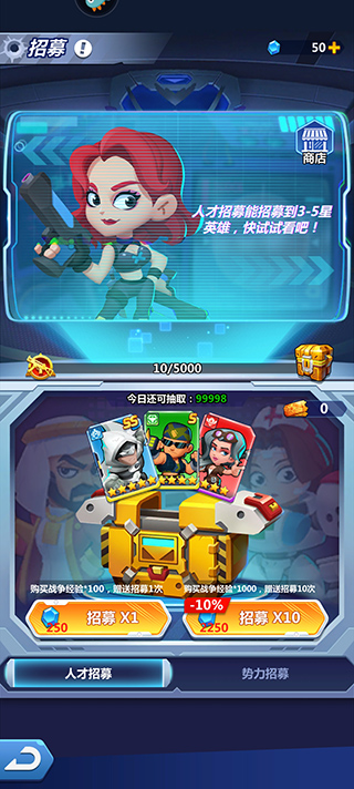 1、招募 玩家在主城点击人才中心即可进行英雄招募,招募需要花费水晶,新人有一次免费机会。