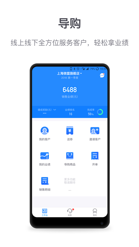一、【客来店】 收银台:可扫描客户付款码收款或现金收款; 核销:核销客户产品、预约、优惠券; 订单管理:管理产品、预约、收银订单; 会员管理:查询会员,会员充值、消费、修改积分; 消息通知:产品、预约、收银订单消息及时通知; 客服功能:手机端客服工具,与客户更便捷地沟通。 二、【微商城】 待办事项:待发货订单、待处理售后订单提醒; 订单管理:对订单进行筛选、发货、改价、标记、取消操作; 售后管理:管理售后订单,同意或拒绝等; 数据统计:支持查看客流分析、客户群体画像、交易转化及明细; 消息通知:待发货、已完成、异常物流、售后订单消息及时通知; 客服功能:移动端在线客服,随时随地和客户便捷地沟通。 三、【智慧美业】 核销:核销券,计次周期卡,积分商城订单; 订单管理:优惠买单订单查看,服务项目接单,到店等操作; 核销记录:查看券、服务项目、积分商城核销记录。更新日志