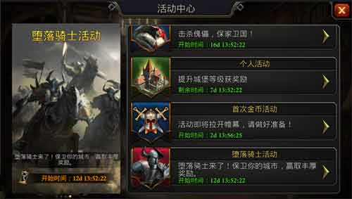堕落骑士入侵,是每半个月就会开启的PVE活动。首先活动,管理要通知到各个成员开启时间,因为人越多,能打到的联盟积分就越高,奖励也越好,开启更高等级的堕落骑士也是需要联盟积分的。刷分要点:一般16堡以上,家里兵多的,自己扛20波是完全没有问题的,但仅靠自己守家的分是不够的,怎么拿更多的分呢?