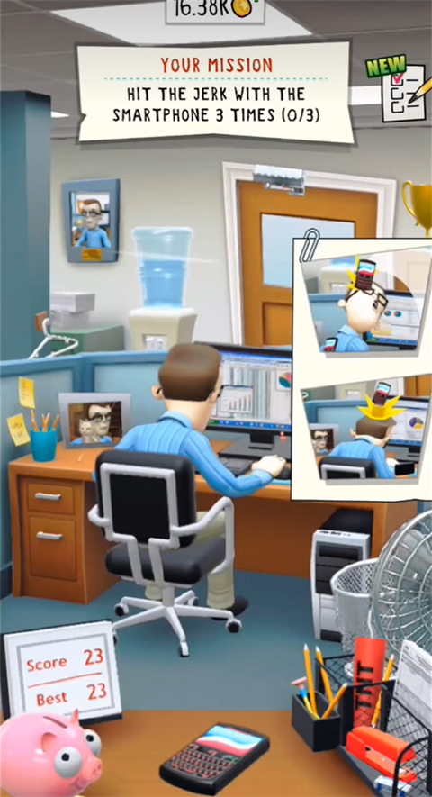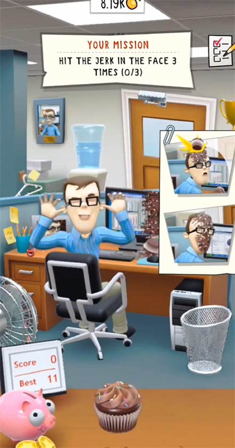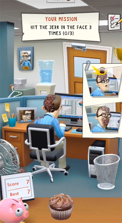 1、终极压力缓解器 度过了沮丧的一天?粉碎、重击并向混蛋扔东西,感觉立刻好起来! 2、用50多种物品击中他 从鱼缸到灭火器,每次击中都是新的反应! 3、解锁秘密恶作剧和互动 在办公室周围点击,发现隐藏的恶作剧! 4、完成每日挑战 成为专业威胁即可获得奖励。 5、丰富的成就 因为你应该用纸杯蛋糕击中他而获得奖杯。更新日志