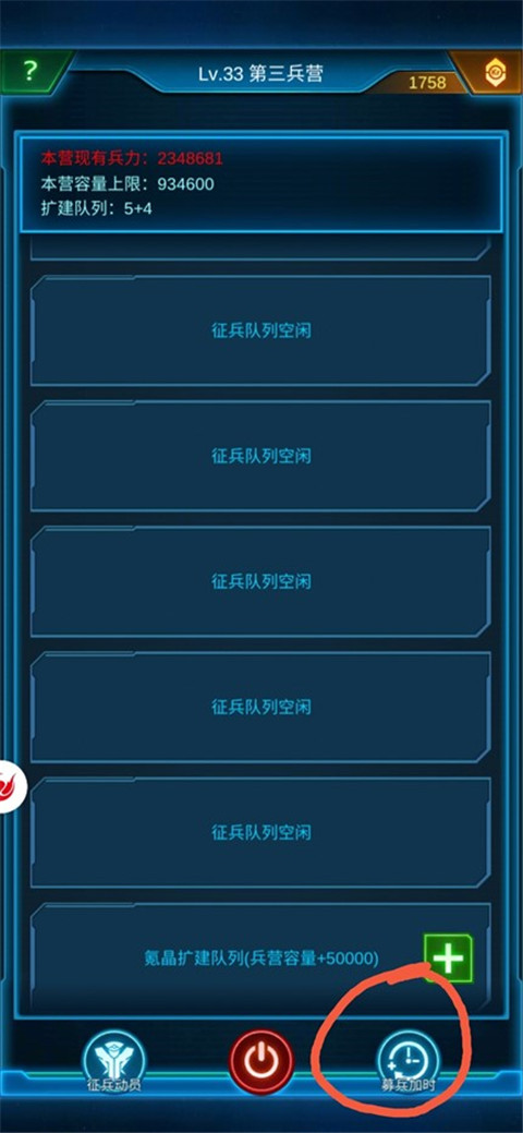 一、兵力为0时候会触发“游荡的士兵”。一天最多两次,每次为主基地兵营一条生产线的满造兵量。如果没刷出来,就下线再上来即可,俗称“重启”。 二、氪金矿刷新时间:1.06,3.11,5.16,7.21,9.26,11.31,13.36,15.41,17.46,19.51,21.56。可以提前一分钟盯着,不然上线晚了,看不到人家已经出兵的兵线,容易“撞矿”。 三、兵营右下角有一个可增加生产线造兵时间的按钮,消耗晶体可以增加生产线时间,最多到2.5小时。还有一个增加生产线数量的按钮,不过需要花氪金。生产线多,且时间长,才能多存兵。