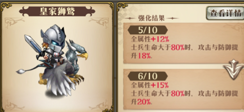 能带的就只有皇家狮鹫这么一个,没有利昂元帅的蝙蝠,也没有雪莉的天使。狮鹫的攻击虽为飞兵中最高的,但80%生命的条件限制比上面几个兵种主动攻击就增加攻击力严格不少,而且练它的人也不多。