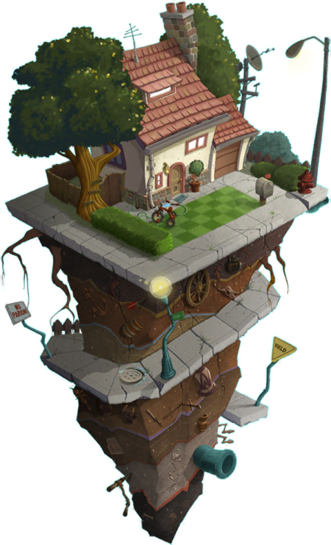 该世界受电影《爱丽丝梦游仙境》的启发。背景第1处:戴夫的家,第2处:僵尸营地,第3处:蘑菇与水壶,第4处:神秘远方,第5处:花圃与南瓜。
