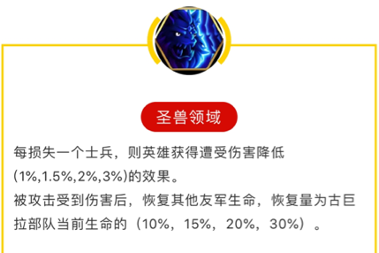 ②天赋后半为古巨拉携带小兵死的越多受到的所有伤害降低越多,最高所有伤害降低30%,其次只要受到伤害就给其他友军群体加血,加血量是古巨拉当前生命值%,最高可达30%。这个加血特效是哪怕一次攻击包含多个分段伤害,每次对古巨拉造成的分段伤害都能触发群体回血一次。