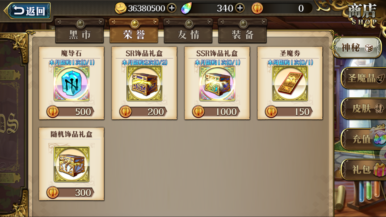荣誉商店可以兑换比较稀有的道具,需要通过荣誉币来兑换道具,荣誉币可以通过竞技场获得。荣誉商店中的道具在一定周期内有购买次数限制