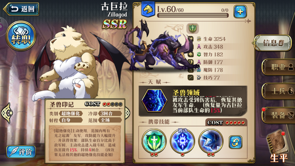 ⑤但巴哈姆特防御力是三种形态中最低的还不如第一种骑兵形态防御高,特点是魔防是三形态中最高的,巴哈姆特没有主动伤害技能和控制技能,两个技能分别是支援护卫技能“巨龙屏障”和被动光环技能“魔防指挥”,魔法指挥所加的魔防和是能超绝叠加的。