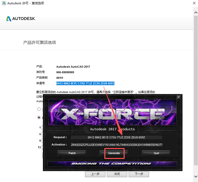 17、将申请号复制到注册机中,点击【Generate】,生成激活码。