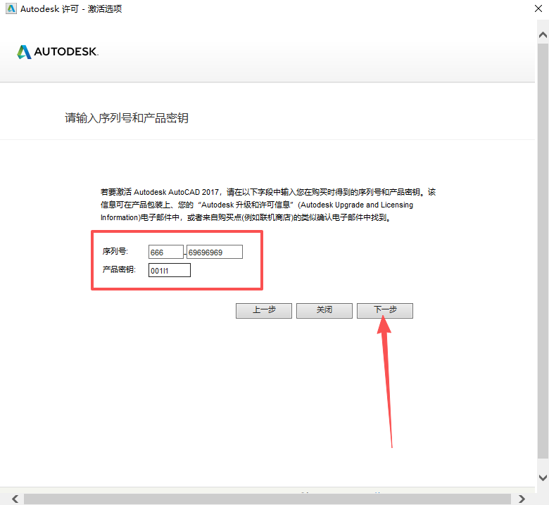 10、输入序列号【666-69696969】, 产品密钥【001I1 】,点击【下一步】。