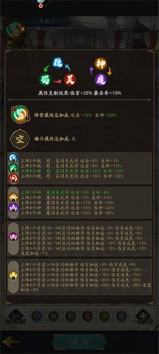 阵容特点:输出突出。乐进、徐盛单群输出强。马良提供攻击增益,“马氏春秋” 组合可进一步强化。曹休前排承伤并输出。周仓配合 “二爷随从” 特性承伤补输出。阵容借马良增益和前排承伤,最大化输出,适合速战速决场景。