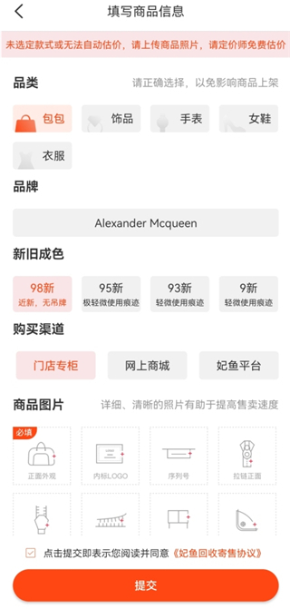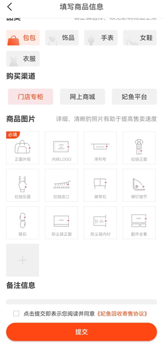 3、之后选择商品的成色和购买渠道,并上传商品的外观、内标LOGO、序列号、拉链正面等照片,全部完成之后点击下方的【提交】就可以了。