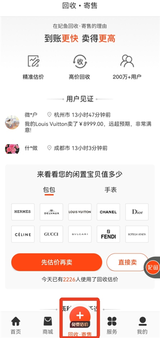 1、登录软件后,点击下方中间的【回收 · 寄售】,你可以先估再卖或者直接卖。