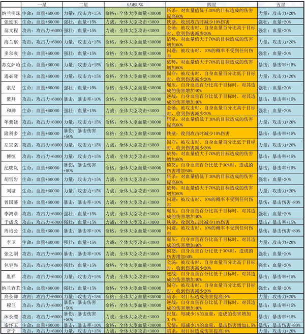 1、天赋属性加成 1星天赋固定2种,2星天赋固定4种,3星天赋固定2种,5星天赋固定4种,4星天赋有12种。 【1星:】 攻击:攻击力+6000 生命:血量+60000 【2星:】 暴击:暴击率+10% 暴伤:暴击伤害+50% 力量:攻击力+15% 强壮:血量+15% 【3星:】 力战:全体大臣攻击+3000 命格:全体大臣血量+30000 【4星:】 暗杀:对目标造成伤害提高18% 报复:每减少1%的血量,造成的伤害增加0.4% 愤怒:自身血量百分比低于30%时,造成的伤害增加60% 固守:被攻击时,自身血量百分比低于目标时,收到伤害减少20% 金汤:被攻击时,自身血量百分比高于目标时,收到伤害减少20% 逆战:自身血量百分比低于目标时,对其造成的伤害增加40% 碾压:自身血量百分比高于目标时,对其造成的伤害增加40% 破势:对血量值大于70%的目标造成的伤害增加60% 闪避:被攻击时,10%的概率不受到任何伤害 铁壁:收到攻击时减少10%伤害 无情:每减少1%的血量,暴击伤害增加1.5% 斩杀:对血量值低于30%的目标造成的伤害提高60% 【5星:】 暴击:暴击率+15% 暴伤:暴击伤害+80% 力量:攻击力+20% 强壮:血量+20% 2、普臣天赋一览