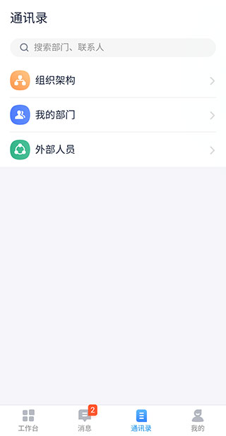 4、【通讯录】页面会显示用户的组织架构等内容。
