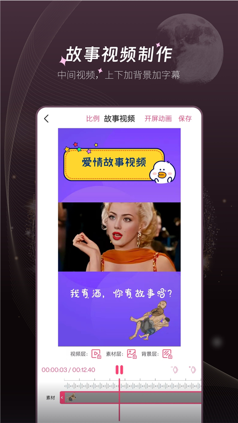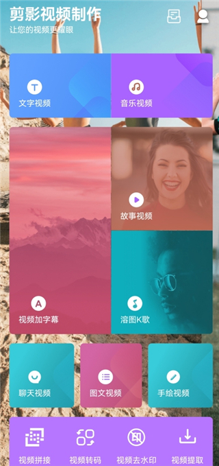 1、视频加字幕 提取视频内原字幕,翻译成新字幕并进行AI配音,自动对齐配音片段与原视频画面,为您解放双手! 2、溶图k歌 视频加字幕一键溶图k歌,让你的视频更有吸引力! 3、图文视频 几张图片即可生成图文视频。也可以视频图文一起编辑成为图文视频! 4、文字视频 音视频智能转换为文字旋转动画字幕! 5、手绘视频 特色功能,高质量原创手绘视频! 6、故事视频 中间视频,上下加背景加字幕! 7、视频加字幕 告别手打,一键添加,样式多! 8、视频提取 一键提取短视频里面的无水印视频! 9、提词器 智能AI提词,台词自然随着你的语速走,既智能又自然! 10、音频提取 一键提取视频中的音频。视频转换为音频! 11、音频裁剪 可以对各类型的音频剪切制作,提取你中意的音频;从本地音乐库导入音乐音频,轻松拖动选择音频裁剪范围! 12、人像抠图 AI 智能抠图,让人更动感。更新日志