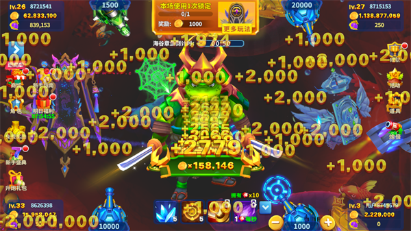 当钱不是很多的时候就可以适当的降低炮弹的等级,然后往小鱼堆里面发射炮弹,这样子一下子黏一堆小鱼,非常赚钱,虽然赚的不多,但是捕获几率确实是提高了,而且能稳赚不亏