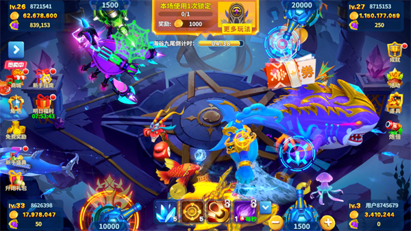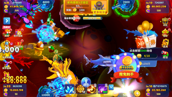 美人鱼BOSS不定时随机出现,自身带有一层护盾。很多玩家看见美人鱼出现了就激动不已,立刻用炮台锁定目标射击,最后弹尽粮绝破了护盾,美人鱼却被房间里的其他玩家捕到了,有种为他人作嫁衣的感觉。所以看到美人鱼出现的时候,不用急着瞄准射击,而是要先调低自己炮弹的倍数,再引导其他玩家一起攻击。这样玩家的子弹消耗的不是很快,护盾也能够快速击破。