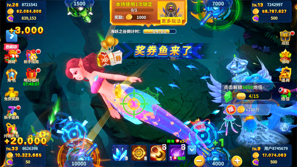 如果子弹逐渐耗尽,每天3次的“系统送粮”就很关键了,把握住机会就会咸鱼翻身。那如何利用这紧张的5000子弹头呢?首先拿到子弹头不要盲目的去射击,要看准奖金鱼,再用锁定去射击。如果锁定时间结束之前能捕获到奖金鱼,立刻回头射击美人鱼BOSS,如果锁定时间过了也没有捕获到奖金鱼,也要立刻锁定射击美人鱼BOSS消耗完剩下的救助金。这样就有机会收割美人鱼BOSS的最后一滴血参加抽奖。