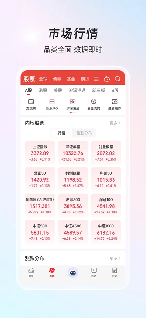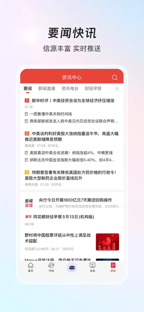1、「行情」 覆盖国内外股票、期货、期权、债券、基金、外汇、指数等,机构专业级行情数据 2、「自选」 实时同步同花顺账号自选股,快速查看自选股行情、公告、新闻、研报,支持自选分组,动态监控 3、「资讯」 每日财经早餐要闻提醒,财经资讯全天候不间断更新,时刻获取证券市场最新动向 4、「深度资料」 为您提供多、快、全、准的上市公司数据,深度挖掘公司基本信息、财务数据、公司公告、新闻研报等专业内容, 5、「搜索」 汇聚全平台多维信息,支持证券、数据、资讯、研报、公告、企业等各类专业内容一键搜索,高效筛选相关内容特色工具