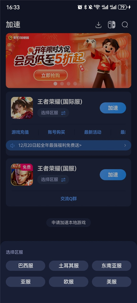 1、以王者荣耀国际服为例子,玩家下载好游戏后打开加速器选择亚服;