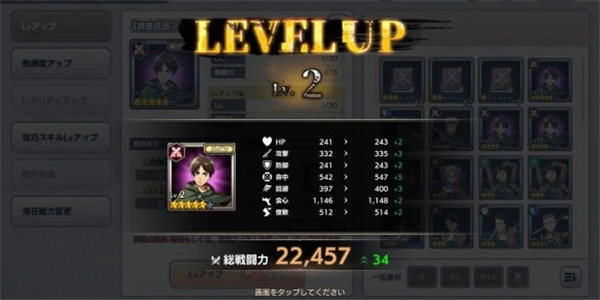 1、指挥军团,消灭巨人! 与艾伦和三笠一起加入调查团,对抗强大的巨人。 一个人或最多四个人可以合作的实时指挥战斗! 2、人气动漫人物登场! Ellen、Mikasa、Armin、Levi、Hange 和 Erwin 加入游戏! 重温《进击的巨人》的世界!一个充满声音的故事。 与您的朋友和朋友全力以赴与巨人作战! 3、会员在家(藏身处)欢迎您 家可以自由定制!如果你安装你最喜欢的项目,成员就会出现! 被成员们治愈吧! 4、简单的训练和战斗[休闲自动进度] 战斗和训练基本上是不需要任何操作的自动进程。 玩家也可以选择!进击的巨人Brave Order如何提升战斗力