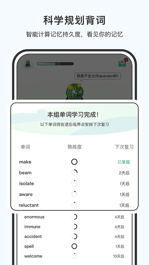 1、【科学规划背词,智能计算记忆持久度】 在背单词的时候,是不是总觉得好像背了很多词,又好像没记住几个词? 小吉背单词基于艾宾浩斯遗忘曲线以及人脑全记忆周期理论基础,科学分析每个单词在你记忆里的持久度。记忆力较为薄弱的单词,我们会智能安排重点复习,提高背单词的效率。通过不断的巩固记忆,单词的记忆持久度会逐渐加强。 2、【贴近真实记忆,精准复习抗遗忘】 背单词过程中,你可以根据自身情况,从“认识”“模糊”“不认识”中选择一项,标记你对这个单词的熟悉程度。系统将会根据你的选择,为你动态调整下一次的复习时间。 背单词需要反复巩固,但如何安排复习同样需要科学高效的方式方法。我们基于遗忘曲线及每个人自身的记忆能力,智能规划复习,在单词的遗忘临界点及时巩固抗遗忘。 3、【精选考试核心词汇,针对性背词】 整合近十年英语类考试真题,精心收录四级、六级、考研、财经金融等核心词汇,帮你高效备考,选词不困扰。 4、【简洁专注背词】 单词记忆的第一步是要达到看词知义,因此在背词过程我们采用了看英文回想对应中文释义的方式。看似简单的记忆行为,却可以达到很好的单词识认效果。软件特色