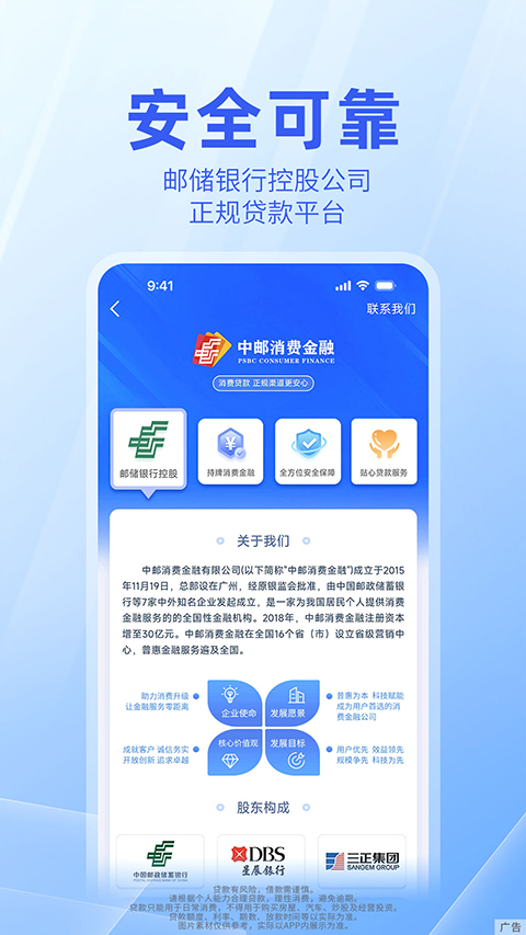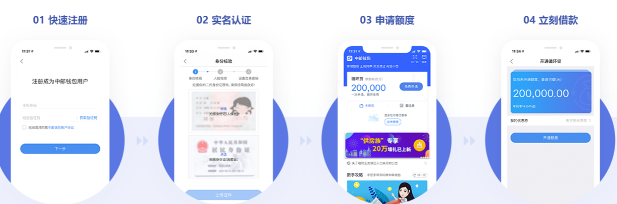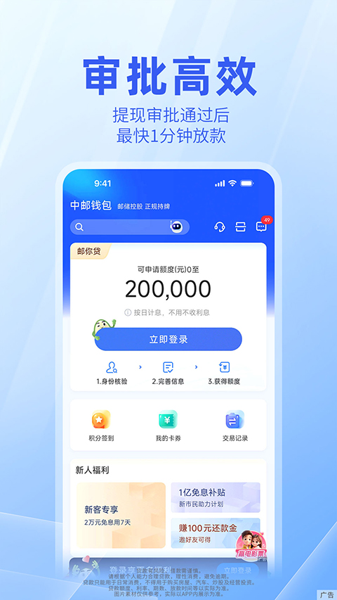 1、贷款 “邮你贷”纯信用无抵押贷款,仅需一张身份证即可申请,额度高达20万,当天即可快速到账。 2、借钱 “邮你花”您的应急准备金,额度先行,随时消费,提现1秒到账,0手续费,利息低至0.035%/天。 3、理财 “中邮宝”活期理财安全有保障,基金收益灵活搭配,申购费低至1折。 4、股市气象 实时推送股票资讯,随时随地查。 5、卡券功能 商家优惠可查询,省钱又贴心。中邮钱包App贷款流程
