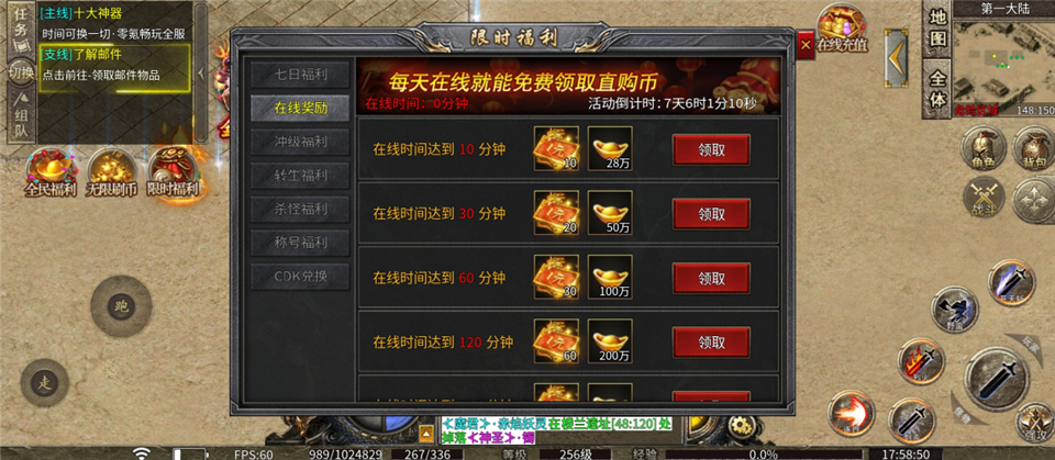 3、在线奖励,每天在线就能免费领取直购币和元宝,上限为360分钟。