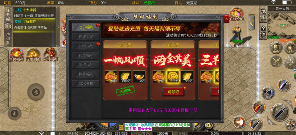 2、点击左侧的【限时福利】,领取【七日福利】,每天登录可以领取充值卡、直购币和元宝等奖励。