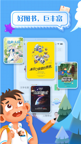 1、汇聚全球36国优秀读物 精选来自全球36个国家的优质图书,涵盖文学名著、童话寓言、科普百科、科幻冒险、少儿启蒙、传统文化、人文艺术、名人励志、学习成长、家庭教育等十大类别,共计20312本优质图书,让全世界的好书,触手可及。 2、分级阅读,让阅读循序渐进 组织强大的教育专家团队与北京师范大学潜心研究,建立了中文分级阅读标准,并将数千本图书根据文本难易度进行了分级。进行分级阅读能力评测的用户,可以依据自己的评测结果阅读能力范围内的书籍,让书籍更适合自己 3、引进新课标必读图书精选版本 引进教育部语文新课推荐图书,独家引进人民文学出版社、二十一世纪出版社等知名出版社精选版本,同时还引进了多种经典系列丛书,如哈佛百年经典、牛津通识读本、牛津英汉双语读物、诺贝尔文学奖作家相关作品、百年百部中国儿童文学经典、沈石溪系列丛书、曹文轩系列丛书、郑渊洁系列丛书等优秀图书。 4、精选书单 精选权威机构和学校推荐书单,让优质阅读有迹可循。如:中国教育部、美国教育部、各地区教育局、权威教育机构推荐书单;人大附中、北师大附中等学校推荐书单。软件亮点