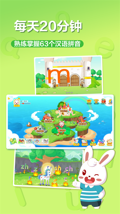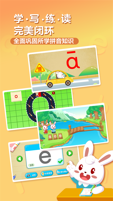 1、快乐学习:超萌的角色、高质的动画,精彩的原创剧情,斗智斗勇,认识朋友,学会配合。4个大型虚拟世界冒险,20个精彩故事串联,60个游戏关卡等着你去挑战! 2、内容全面:包括23个声母、24个韵母、16个整体认读音节,以及600个常见汉字的拼 读。零基础入门,覆盖完整的汉语拼音知识点,学习过程层层提升,每天都有进步。 3、教学生动:视频讲解+儿歌口诀+对比学习+形象记忆,化抽象为具体,更容易吸收和理解。 4、寓教于乐:将知识点融入在游戏关卡中,只有学会了相应的知识点才能过关。让孩子玩游戏的过程中不知不觉学会拼音。 5、还有读一读,写一写、拼一拼,同步测试组合教学,让孩子口、手、脑都动起来,更牢固地掌握拼音知识。 6、每天只能完成学习一个新关卡,防止孩子长时间使用手机。游戏超过30分会自动上锁,需要家长帮助才能解锁。软件优势