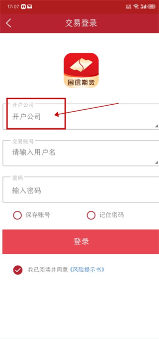 3、进入交易登录界面后,在开户公司栏里选择“国信期待CTP”,然后输入账号及密码进行登录。