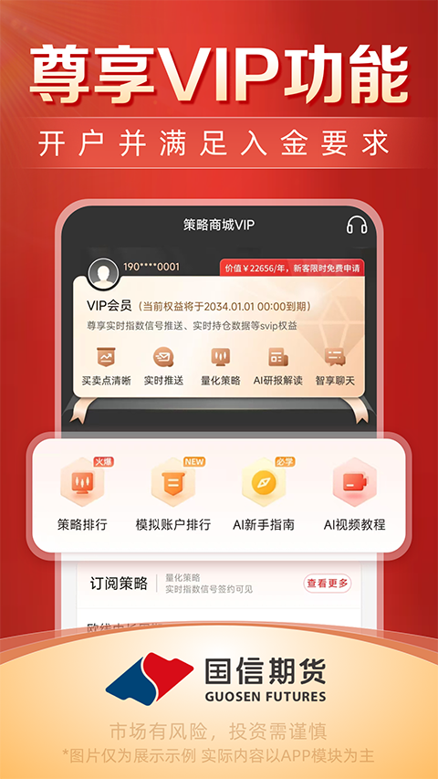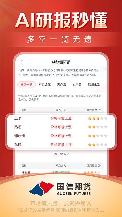 1、期货开户 便捷轻松,零资金、无门槛快速开户。 2、期货行情 实时精准的国内外期货行情,多种分析周期及技术指标,期货品种全覆盖。 3、期货交易 手机在线交易,方便快捷的银期转账服务。 4、期货资讯 让用户了解更多的期货资讯动态,获取更多全球财经资讯。 5、AI研报 帮助用户快速解读品种研报。 6、策略超市 量化策略模型供用户订阅。 7、组合榜单 用户可以根据订阅的策略自行组合。国信期货开户交易app在使用中的问题