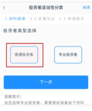 6、选择投资者类型(注意:线上仅受理普通投资者业务,专业投资者请前往柜台办理);