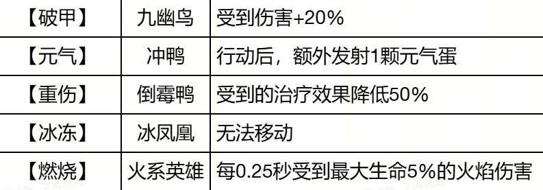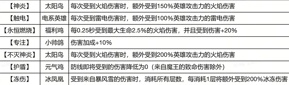 从左往右分别是效果名称、来源英雄、效果描述 1、攻击强化、诅咒、巨大化、狂暴、减速
