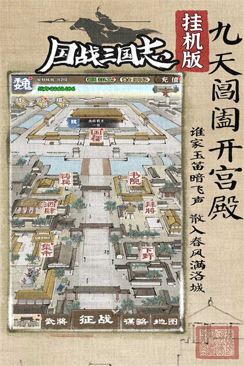 1、收集武将,搭配阵法的九宫格推图的游戏。 2、非常简单的轻国战对抗,放置挂机类型。 3、独创战斗系统,让玩家体验畅爽战斗。 4、精心设计的画面,给予玩家全新游戏体验。更新日志
