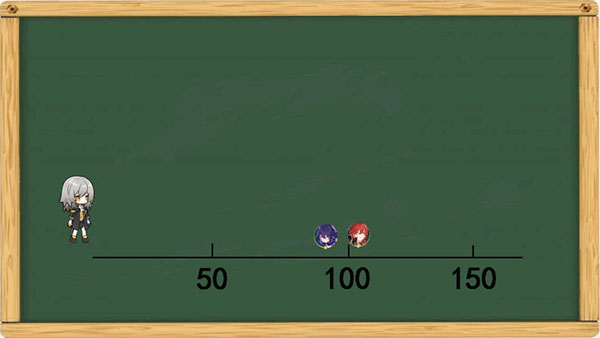 加/减速对于行动轴的影响则区别于推拉条,并不能直接改变 t ,而是通过改变速度来影响你的T值,同时按T值变化的百分比对当前的 t 进行变化,我们以时间为轴来表示,已知初速度的希儿的T为87,在跑了一半距离,即剩余时间 t=43.5的时候获得了艾丝妲的加速BUFF,提升了50的速度变为165,那么她的T应该变为60,剩余时间 t 就应该变为43.5*(60/87)≈30,也就是在时间的行动轴上提前了13.5个单位的位置。