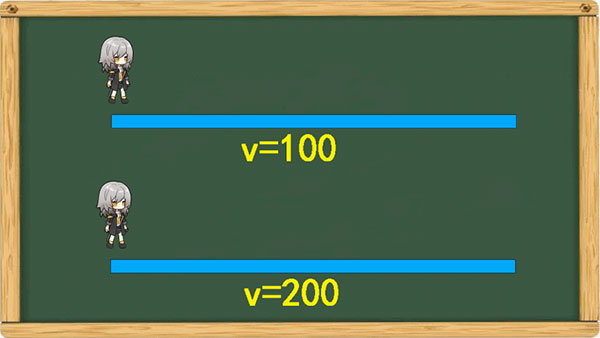 简而言之就是,星铁的每个角色都需要在一圈的长度S=10000的赛道上进行赛跑,角色每跑一圈进行一次【行动】,根据S=vt的公式,速度v越快的角色就能越早的进行【行动】,速度200的角色A花的时间就比速度100的角色B要少一半,所以当B行动一次的时间里A就可以行动两次,如下图: