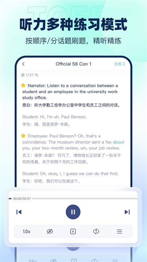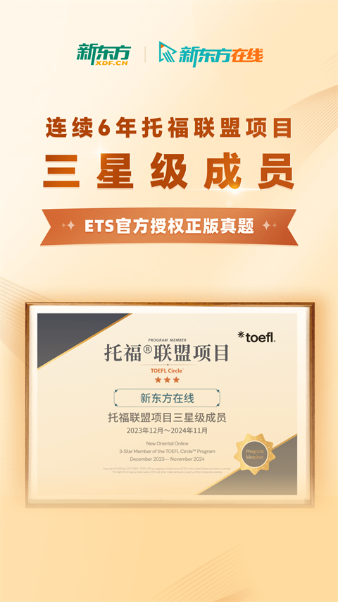 1、【阅读/听力/口语/写作练习】 ETS官方授权正版题目,手机在线轻松刷题; 配套专业解析及高分范例回答。 2、【多种学习模式】 按顺序做题,覆盖日常练习、考前练习; 按话题做题,重点攻克薄弱话题,快速查缺补漏; Official 30-54 原文精听精练,支持倍速调节、逐句循环。 3、【口语高分范例回答】 托福口语高分教师高分答题音频,听范例,学思路,举一反三。 4、【题目互动讨论区】 超多学员及实力师资答题思路分享讨论,学习讨论区氛围活跃。 5、【复习频道】 你的专属笔记本,做题时间、做题数量、正确率实时反馈; 错题自动记录,可查看详解,重点复习,事半功倍; 难题/难句/生词一键收藏,针对性复习,高分有迹可循。 6、【学习社区】 搜罗托福考试资讯、新东方实力师资备考干货、高分学员备考经验,只为让你顺利斩托~托福考试常见问题解答