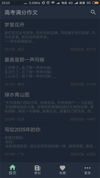 1、进入app可以在“首页”浏览各种作文内容 2、如果发现想要阅读的作文,就可以点击作文的标题 3、然后就可以快速跳转到作文的详情界面 4、这样学生就能在平台开始阅读作文内容了 5、在“素材”界面可以获取许多作文素材 6、你可以掌握app提供多的素材标签 7、只需要点击对应的素材标签,就能进入到对应的素材内容界面软件优势