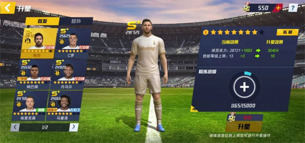 6、玩到11级左右(忘了11还是12了),升星功能开启,升星主要是吃球员+升星材料,球员要求倒不高,s+只要a+的就行了。吐槽下,升星功能开启竟然也没有引导,我还找了一段时间才找到哪里进去,必须吐槽。不过升星加成还是挺可观的,s+升一星瞬间加200的能力,开心!