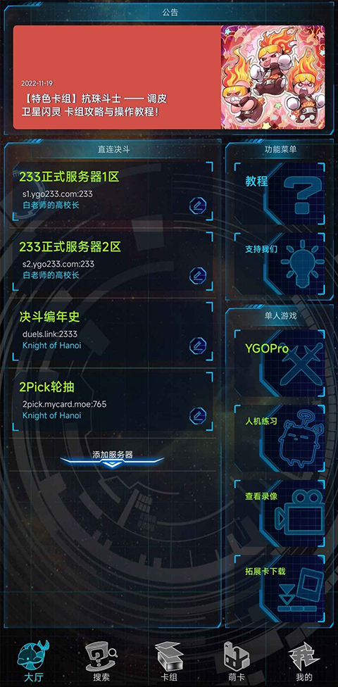 更新: 1.更新ygopro内核; 2.新卡TW03+VJ; 变更: 1.修正删除卡组时有时不能同时删除在线备份卡组的问题; 2.修正从外部导入的卡组有时不能正确被备份的问题; 3.修正上传在线备份卡组时有时没有进行卡组分类的问题; 4.卡包展示时不再允许撤回和重做修改; 5.移动卡片后没有和移动前出现差异时,不再计入可撤回记录; 6.优化图标设计,使其更符合功能名称; 7.因为一些地区网络限制无法即时发现新版本,检查更新失败会提示跳转B站暗星的动态,欢迎私信询问暗星更新地址等资源;游戏截图