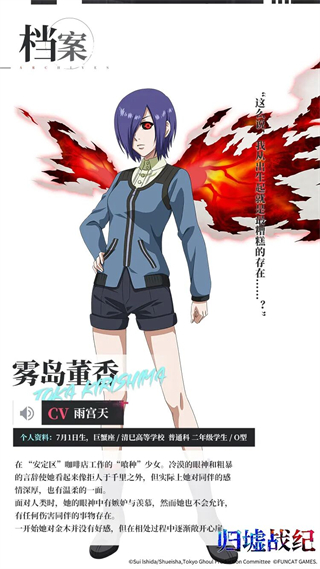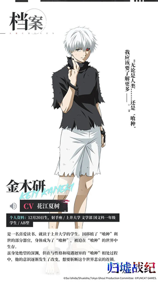 东京,在这里生活着一群被称为“喰种”的怪物,他们潜伏在人群之中,狩猎人类。喜爱读书的金木研在常去的咖啡店“安定区”里,遇见了某位女性。不管是年龄、境遇和阅读兴趣都相同的两人逐渐彼此亲近,但是……在书店的约会后,金木研被卷入了改变其命运的事故之中,被迫移植了“喰种”的器官……归墟战纪游戏主要角色介绍