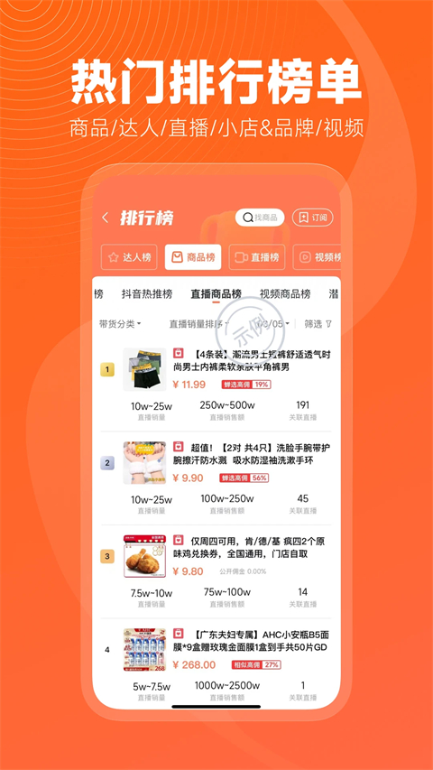 1、商品榜单,海量商品资源任意选择; 2、精准数据,第一时间更新各榜单数据; 3、商品详情,爆款短视频电商数据; 4、达人详情,提供精准达人数据分析。功能介绍