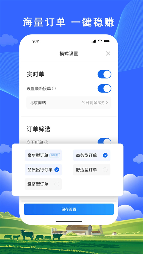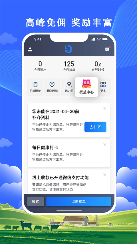 1【合规平台|高德联盟】高德打车免佣联盟官方合作平台; 2【海量订单|接单稳赚】智能化多场景订单推送,就近派单轻松接,预约订单优质价更高,更多场景订单任意切; 3【接单免佣|奖励丰富】工作日早高峰免佣,晚高峰奖励,日冲单奖励,周流水奖励等更多丰盛大额奖励你; 4【结算便捷|收入无忧】 完单无需催付款,平台即垫付佣金秒到账;每周提现到支付宝,提现方便又快捷; 5【服务专业|】7*24小时客服在线提供服务,及时为您排忧解难;软件功能
