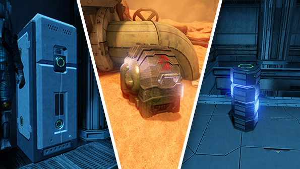储物柜和其它容器会出现在你的任务里,它们包含当前任务中对你有所帮助的补给品(比如你 Warframe 的生命值和能量的补给,还有武器的弹药)。它们还包含任务结束后会用到的物品,比如买新物品的现金,和铸造厂中建造物品的资源。储物柜可以打开但是其它容器需要你用武器将容器打破,里面的物品才会掉落。